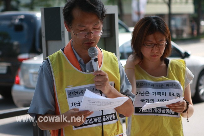 참여연대, 민주노동당, 전국장애인차별철폐연대 등 26개 시민·사회단체 및 정당으로 이루어진 기초법개정공동행동(이하 공동행동)은 21일 ‘기초생활 수급자 죽음으로 내모는 보건복지부 규탄 기자회견’을 갖고 부양의무자 확인 조사로 인한 수급비 삭감 및 탈락을 철회하고, 부양의무자 기준 폐지를 촉구했다.