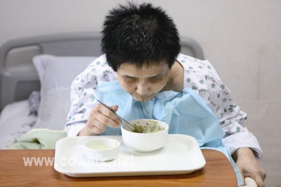 | ▲ 병원에서 여성장애인이 허겁지겁 밥을 먹고 있다. 얼굴 전체에 시퍼런 멍자국이 있었다. | ||
