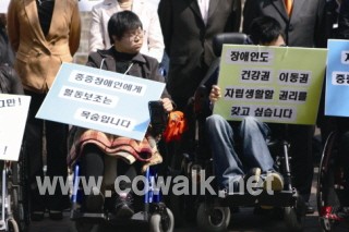 그러나 그 알맹이는 전혀 그렇지 못했다. 날치기로 만들어진 ‘장애인활동지원에 관한 법률’과 정부의 예산안은 대상자를 1급 장애인 5만명으로 제한하고, 최중증 장애인이라도 월 180시간 이내로 서비스 양을 제한했으며, 오히려 노인요양보험제도와의 ‘형평성’을 이유로 장애인의 본인 부담을 월 15%까지 인상하는 등의 내용이었다.