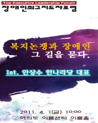 2011년 올해 장애인최고지도자포럼의 첫 문을 열 주자로는 한나라당 안상수 대표가 나선다. 현재 한나라당은 서민과 중산층을 아우르는 70% 맞춤형 복지, 자활 가능한 투자형 복지를 내세우고 있다. 이와 관련, 안상수 대표는 “장애계 최고지도자들과 함께 하는 이번 포럼을 통해 지속가능한 복지발전의 방향을 함께 고민하고 장애인복지의 맞춤형 전략을 수립할 묘안을 나누는 시간이 되기를 바란다”고 밝혔다.