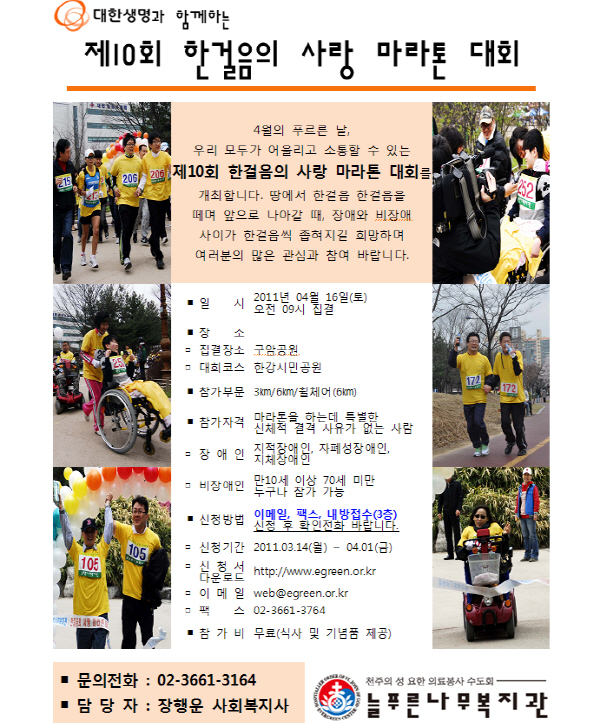 이번 대회는 오는 4월 16일(토) 오전 9시 강서구 가양동 구암공원에서 집결하며, 한강시민공원까지 3km, 6km, 휠체어부문 6km로 나뉘어 진행된다. 마라톤을 하는 데 특별한 결격 사유가 없는 이는 누구나 참가 가능하며, 참가를 원하는 이는 늘푸른나무복지관 홈페이지(www.egreen.or.kr)에서 신청서를 내려 받아 작성한 후 이메일(web@egreen.or.kr)이나 팩스(02-3661-3764)를 통해 접수하면 된다. 내방 접수는 서울시 강서구 허준로 5길 37번지(강서구 가양2동 1470-2번지)늘푸른나무복지관을 찾으면 된다.
