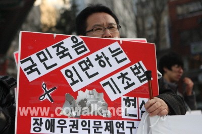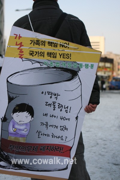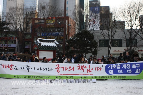 잠시 나는 할 말을 잃고 말았다. 이 나라가, 이 나라의 사회복지를 한다고 떠드는 사람들이 정말 해도해도 너무한다는 생각이 들었다. 왜 수급신청을 하지 않느냐고 하자 2009년 중순경에 10년 넘게 연락을 안 하던 자녀들과 만나고 있다는 이유로 수급 대상에서 제외됐다는 것이었다. 노동하고 싶어도 노동할 수 없는 사회, 노동할 수 있는 조건을 만들어 주지 못하는 사회에서, 최저생계비 이하의 삶을 살아도 국가의 최소한의 지원조차 받을 수 없는 국민기초생활보장제도(이하 기초법)의 부양의무제 기준 때문이었다.