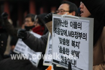 생계를 비관해 잇달아 일어나고 있는 죽음의 행렬을 이번 2월 임시국회에서 반드시 끝낼 수 있기를 간절히 바란다. 더군다나 너도나도 복지를 이야기하고 있는 지금, 그 어느 때보다 추운 이번 겨울, 410만 명의 기초법 사각지대에 있는 비수급 빈곤층과 수급을 받고 있어도 지독한 가난 속에 매일매일 살아가야 할 157만 명 수급자들을 다시 한 번 생각해야 하지 않을까. 가장 극한의 빈곤상황에 놓여있는 이들을 배제한 복지정책이라면 그것은 소리만 요란한 깡통복지이다.
