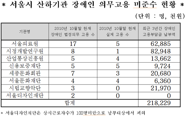 서울시의회 민주당 김선갑 의원이 서울시 산하기관의 2008~2010년 10월말까지 장애인 고용부담납부액을 분석한 결과 산하기관 8곳이 장애인 의무고용대신 고용부담금 2억1천822만9천원을 납부한 것으로 확인됐다고 밝혔다.