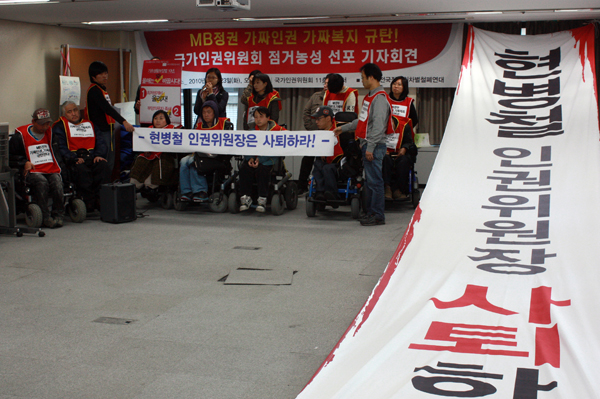 전국결의대회를 마친 참가자들은 곧바로 국가인권위원회 앞으로 이동, 현병철인권위원장 사퇴촉구 인권시민단체 대책회의와 함께 MB정권의 가짜인권·가짜복지를 규탄하고 장애인생존권을 쟁취하기 위한 투쟁결의대회를 이어나갔다.