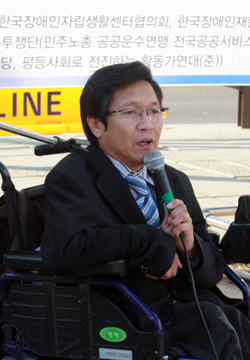 한국장애인자립생활센터협의회 박홍구 회장은 “장애인의 인권을 사회적으로 실현하는 제도가 활동보조 서비스다. 우리는 수 년 간 활동보조 서비스의 확립과 발전을 위해 끊임없이 투쟁해왔지만, 이번에 의결된 정부의 활동지원법 안에는 장애인들의 요구를 무시하고 우롱하는 듯 그런 내용들이 전혀 없다. 장애인이 왜 비장애인들과 함께 지역사회에서 살아야 하는지 전혀 알지 못하기 때문. 그런데도 인권을 이야기하는 국가인권위원회가 가만 있어서야 되겠냐.”고 지적하고 “우리의 요구가 쟁취될 때까지 함께 연대 투쟁하길 바란다.”고 당부했다.