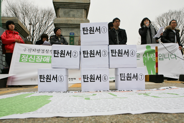 | ▲ 장애인차별금지추진연대는 지난 17일 수원지방검찰청 앞에서 기자회견을 열고 '아파트 주민들의 정신장애인 가족에 대한 집단 폭력 사건'에 대해 가해자들의 처벌을 요구하며 탄원서를 제출했다. (사진제공=장추련) | ||
