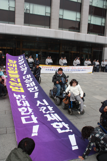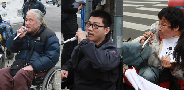 이준수 씨(31, 뇌병변1급)는 “장애로 인해 정규교육을 받지 못해 야학에서 공부도 하고 있고 취업프로그램에도 참여했지만, 이 사회에서 내가 취업할 수 있는 곳이 없었다. 사회와 정부가 우리를 너무 힘들게 하고 있다.”고 토로하고 “그래서 여전히 불안정 고용형태로 노동을 하는 아버지와 과일가게를 운영하시는 어머니에게 의지해서 살고 있다. 부모님의 고충을 덜어드리고 싶지만 그건 불가능할 것 같고, 마지막으로 기댈 것은 기초생활수급비 뿐이다. 가족의 짐이 되지 않도록 수급권을 달라.”고 주장했다.