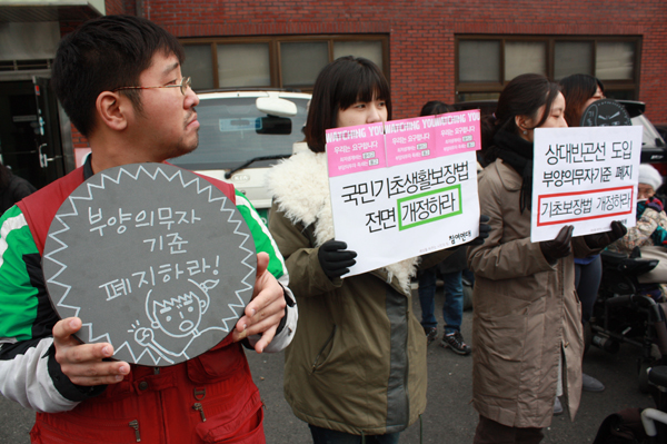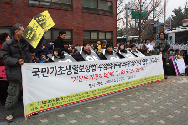 기초법개정공동행동은 이어 “지금의 빈곤과 불평등의 문제는 개인이나 가족이 아닌 사회구조에 의한 것이기 때문에 가난한 이들이 더욱 가난해지고 더 확대되는 지금, 빈곤해결을 위한 국가의 책임이 시급한 시점”이라며 “이명박 정부는 더 이상 국민을 우롱하고 기만하는 정책을 중단해야 하며, 그러기 위해서는 빈곤의 책임을 가족에게 넘기는 부양의무제 기준을 폐지하고 최저생계비 현실화를 위해 상대빈곤선을 즉각 도입해야 한다.”고 주장했다.