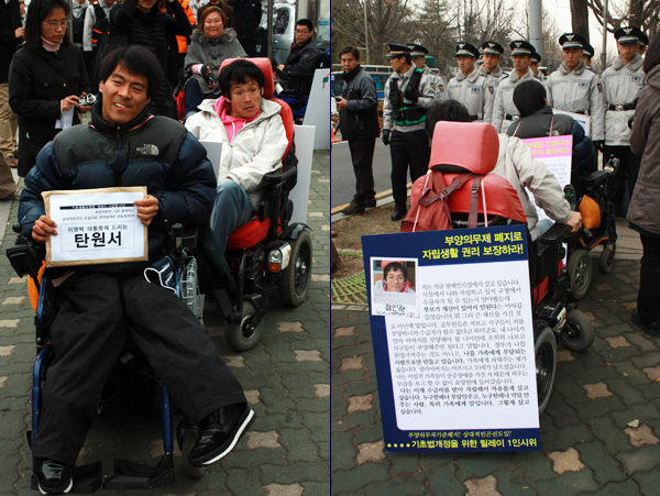 몇 달 전 자립생활을 위해 양천구청에 사회복지서비스 변경신청을 했다가 거부처분을 받은 황인현 씨(41, 뇌병변1급)는 “지금 장애인생활시설에서 살고 있는데, 시설에서 나와 자립하고 싶어 구청에서 수급자가 될 수 있는지 문의하자 공무원들이 가족이 나를 부양하기 때문에 수급자가 될 수 없다고 말했다. 내가 부모님을 부양해야 할 나이인데, 부모가 나를 부양하기 때문에 안 된다니 내가 가족에게 부담되고 피해주는 것 같아서 내 자신이 싫다.”고 울분을 토했다.