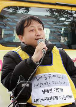 한국뇌병변장애인인권협회 유흥주 회장은 “정부가 법 제정을 준비하는 걸 보면, 장애인들을 악세서리 취급할 뿐 한 인간이나 사회구성원으로 인정하지 않고 있다는 것을 알 수 있다. 정부는 ‘장애인이 하지 못하는 게 많다’는 이유로 사회구성원으로 인정하지 않지만, 우리는 사회구성원으로 살아가는 데 가장 기본적으로 필요한 활동보조인을 통해 부족한 능력을 커버하고 사회구성원으로 활동할 수 있다.”면서 “활동보조서비스는 우리의 인격을 지키는 것이며, 모든 것을 자본의 논리로 대상화하고 비인격화시키는 정부에 맞서야 투쟁해서 활동보조서비스를 지켜내자.”고 결의를 다졌다.
