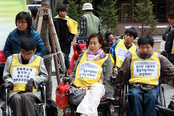 전국장애인차별철폐연대 박경석 대표는 “UN장애인권리조약 위원회에 낼 실태조사 보고서에는 우리나라 장애인들이 아프리카에는 없는 활동보조서비스를 받으며 행복하게 잘 살고 있는 것처럼 기록되어 있다. 이렇듯 우리가 우리의 목소리를 내지 않으면, 우린 계속해서 이명박 정부의 친서민 복지정책의 도구로 이용될 것이므로, 장애연금에 이은 이명박 정부의 2번째 사기극인 장애인활동지원법에 절대 속지 말고 우리의 권리를 찾아 투쟁하자.”고 결의를 다졌다.