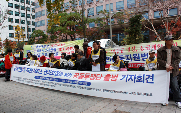 공투단은 11월 8일 오전 여의도 국민은행 앞에서 출범을 알리는 기자회견을 열고, 정부가 내년 10월 도입을 위해 올 정기국회에서 법률 통과를 추진 중인 장애인활동지원제도의 문제점을 지적하고 저지하기 위한 본격적인 활동을 선언했다.
