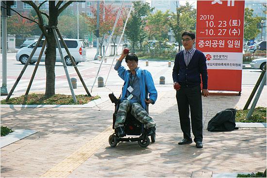 몸이 불편해 전통휠체어를 타야하는 그에게 장애인 콜택시는 생활에 없어서는 안 될 꼭 필요한 이동수단이다. 운남동에서 야학이 있는 첨단지역까지 저상시내버스가 운행되기는 하나 1시간에 1대꼴로 운행되며 그나마 시간도 들쑥날쑥 해 시간 맞추기도 힘들고, 때론 탈 수도 없을 만큼 사람들이 붐빌 때도 있다. 그리고 무엇보다도 불편한 것은 버스에서 내려도 야학이 있는 곳까지는 한참을 가야 한다는 것이다. 휠체어가 가기에는 너무도 불편한 길이 우리나라의 도로 현실이다.