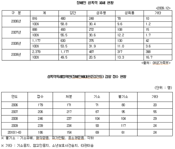 이 의원이 최근 여성가족부로부터 제출받은 자료에 따르면, 장애인 성폭력 피해 건수가 2006년 816건에서 2009년 2천379건으로 3배 가까이 급증했고, 피해유형 대부분이 강간인 것으로 나타났다. 그러나 「성폭력범죄처벌등에관한특례법」(이하 성폭력특례법) 위반(장애인에대한준강간등)에 대한 검찰 접수 현황을 확인해본 결과, 2006년 179건 중 71건만이 기소 처분 됐으며, 2009년에는 239건 중 93건, 2010년 1월부터 8월까지 186건 중 69건 등 기소율이 40%에도 못 미친 것으로 나타났다.