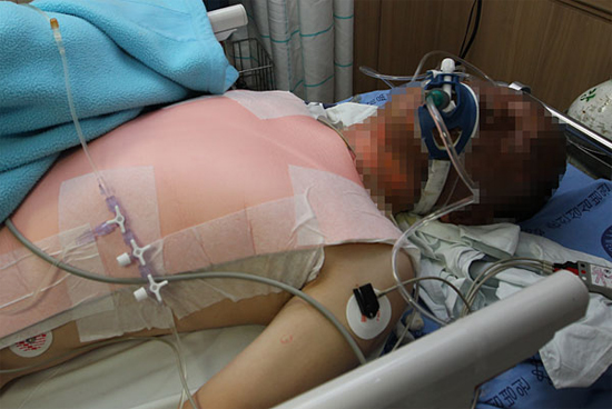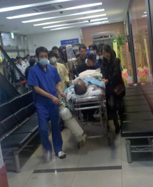| 분신한 KEC 김준일 지부장이 31일 새벽 5시45분께 서울 영등포 한강성심병원으로 긴급 이송된 후 의료진의 진찰을 받기 위해 대기하고 있다. [출처: 이명익 노동과세계 기자] | ||