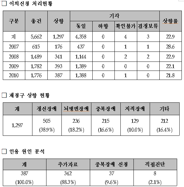 이중 387건인 21.8%가 1찬 판정보다 등급이 상향됐으며, 상향조정된 건을 분석해보면 정신장애가 38.9%, 뇌병변장애가 18.2%, 중복장애가 16.6%, 지적장애가 10.0%인 것으로 나타났다.