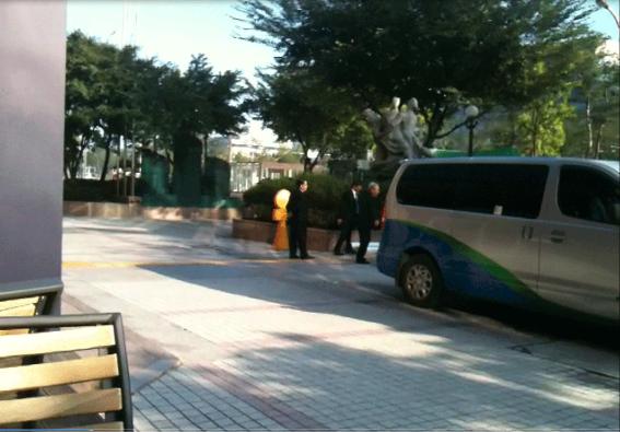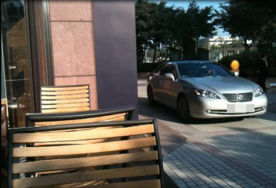 | 장애인개발원 이용흥 원장이 직원들의 의전을 받으며 개인소유의 외제차량을 타려고 하고있다. (사진제공=민주당 박은수 의원실) | ||