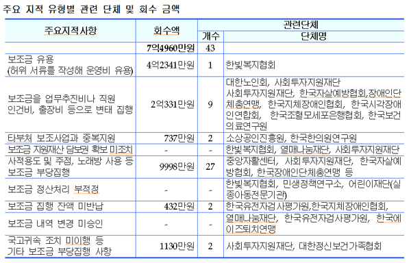 이밖에 대한정신보건가족협회는 자체 강의와 행사 진행 업무를 담당 한 직원에게 강사료와 행사 준비 수당을 지급했으며, 한국지체장애인협회는 국고보조금 미납액을 반납하지 않고 자체 인건비로 부당 집행한 사실이, 장애인재활협회는 자체 직원의 건강보험료를 국고보조금에서 지급한 사실이 드러났다.