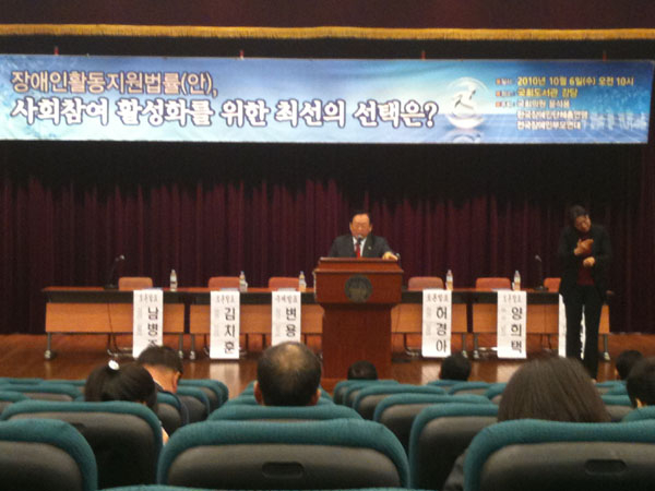 이어 허경아 부장은 “2008년 장애인 실태조사에 따르면 지적, 자폐성장애인과 뇌병변장애인이 활동지원제도가 가장 필요한 이들로 조사됐으나 현행 대상자 인정조사표는 이들을 위한 서비스 내용이 없으며, 2차 시범사업에 주간보호 서비스가 추가됐지만 이외엔 아무것도 바뀐 게 없다.”며 “실효성 있는 법이 되려면 실제로 필요한 유형과 대상에게 서비스를 줄 수 있는 인정조사표의 수정이 시급하다.”고 주장했다.