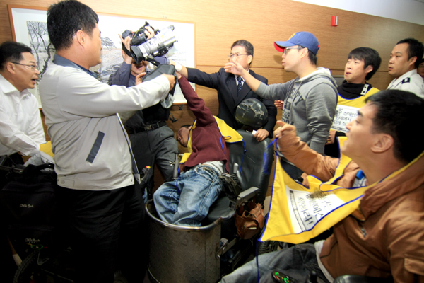 김 구청장은 “‘해줄 게 없다’는 말은 해당과에서 검토의견을 보낸 것일 뿐 확정된 내용이 아니다. 주민자치위원회 내에 구성될 장애인분과위원회에서 우선순위를 정해 예산을 요청하면 수용하겠으나, 지급 (서울장차연의) 요구는 개별 민원에 다름없기 때문에 받아들일 수 없다.”고 못을 박자 박경석 공동대표는 “우리가 요구하는 사항은 우리 이익을 추구하기 위해 이 자리에 온 게 아니라 장애인당사자들의 보편적 권리를 요구하기 위해 이 자리에 왔다. 지금 구청장께서 이야기하는 말은 (장애인 단체끼리) 이이제이(以夷制夷)를 부추기려는 것으로밖에 보이지 않는다.”고 맞받아쳤다.
