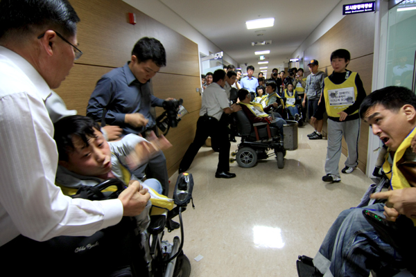 서울장애인차별철폐연대 소속 활동가 20여명은 ▲활동보조서비스 월 100시간 추가지원 ▲체험홈 및 자립생활가정 설치 ▲장애인자립생활센터 운영비 지원 등을 요구하며 29일 서울 은평구청 6층을 점거하고 구청장 면담을 요구했다.