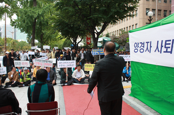 김정록 회장은 단식농성에 앞서 진행된 결의대회에서 “이명박 대통령은 말로는 공정한 사회, 정의로운 사회를 만들겠다 하면서 대선 당시 자신을 도와준 사람에게 자리를 내어줌으로써 장애인을 기만하고 무시하고 있다. 480만명 장애인 중에 장애인 노동을 책임질 사람이 한 명도 없어서 일흔도 넘은 비전문가를 수장에 앉혔냐.”며 강하게 규탄하고 “지금껏 4개월동안 투쟁하면서 정치인들에게 수차례 양경자 이사장의 퇴진을 요구했지만 안상수 한나라당 원내대표 외의 많은 국회의원들이 외면했다. 그냥 넘어가면 장애인들의 권리와 자존심은 또 바닥으로 떨어질 것이다. 나경원 의원은 자신이 대표가 되면 이 사태를 꼭 짚고 넘어가겠다 했지만 대표가 되든 안되든 양 이사장을 물러나게 해야 하며, 양 이사장과 누나 동생으로 지낸다는 정두언 의원은 개인적인 관계를 떠나서 공사를 확실히 구분해야 할 것.” 이라고 주장했다.