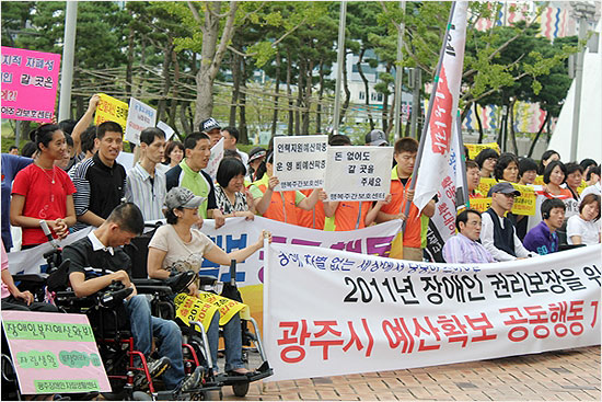 2011년 장애인 권리보장을 위한 광주시 예산확보 공동행동(이하 공동행동)은 6일 오전 광주 시청사 앞에서 기자회견을 열고 “민선5기 첫 예산에 장애인 권리를 보장하라”고 요구했다. 강 시장이 약속했던 “장애인 복지예산 100억 원 추가확보”가 공염불이 될 가능성이 농후해서다.