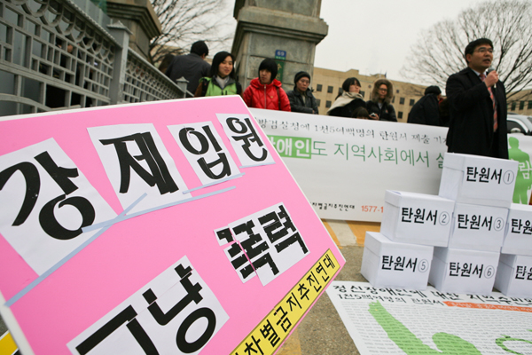 | ▲ 장애인차별금지추진연대는 지난 17일 수원지방검찰청 앞에서 기자회견을 열고 '아파트 주민들의 정신장애인 가족에 대한 집단 폭력 사건'에 대해 가해자들의 처벌을 요구하며 탄원서를 제출했다. (사진제공=장추련) | ||
