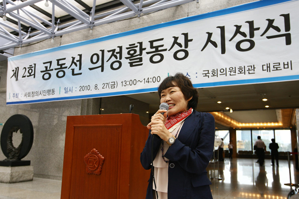 사회정의시민행동 관계자는 “곽정숙 의원이 정신장애인 차별 철폐를 위한 43건의 일괄 개정안을 낸 것을 비롯해 빈곤층 권리보장을 위한 국민기초생활보장수급자 실태조사 및 현장방문을 실시했으며, 결식아동 급식지원 등 민생예산 확보를 위해 노력하는 등 다양한 영역에서 활동해와 수상자로 결정했다.”고 밝혔다.
