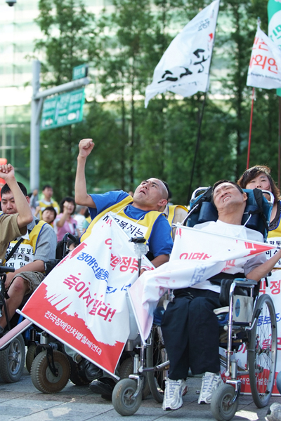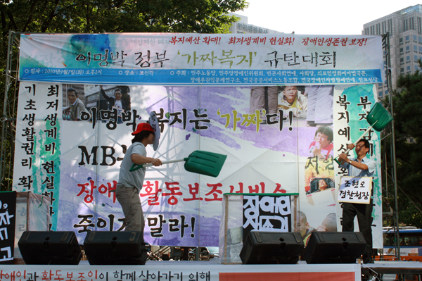 ‘이명박 정부 가짜 복지 규탄 결의대회’가 전국장애인차별철폐연대(이하 전장연), 민주노동당, 민주당장애인위원회, 빈곤사회연대, 사회당, 의료민영화저지범국민운동본부, 장애우권익문제연구소, 전국공공서비스노동조합, 진보신당의 공동주최로 7일 오후 2시 서울 종로 보신각 앞에서 열렸다.