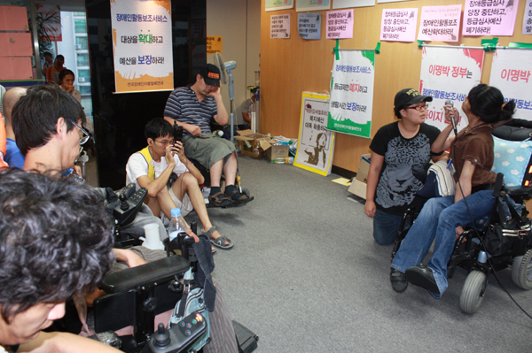 6층 사무실을 점거하고 단식 중인 한 활동가들은 “몇 년 전 활동보조서비스를 만들기 위해 한강 다리를 기었고, 삭발을 했다. 매번 농성을 할 때마다 ‘이것이 마지막이었으면 좋겠다.’고 생각하지만 지금 또 단식을 하고 있다.”고 토로한 뒤 “우리는 분명 가축이 아닌 사람이다. 배가 고파도 이 사실을 분명히 알리기 위해 우리는 끝까지 포기하지 않고 투쟁할 것”이라고 결의를 다졌다.