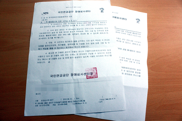 | ▲ 전장연 소속 활동가들의 점거농성이 이어지자 장애등급심사 센터 측은 2차 퇴거명령을 농성단에게 요청했다 ⓒ김라현 기자 | ||