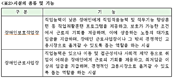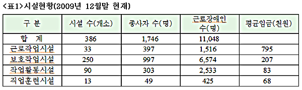 정부는 1999년 「장애인복지법」을 개정하면서 직업재활시설을 ‘작업활동시설’, ‘보호작업시설’, ‘직업훈련시설’, ‘근로작업시설’, ‘생산품판매시설’로 분류하는 등 활성화를 모색했다. 그 결과 양적으로는 증가했으나 장애인 고용의 대안으로 자리매김하지 못하고 있으며, 특히 시설유형별 역할과 기능, 운영 면에서 많은 문제점이 노출되고 있음이 수차례의 평가결과 나타났다. 일례로 2009년 12월말 현재 근로작업시설과 보호작업시설의 평균임금이 각각 79만5천원, 20만7천원인데 비해 작업활동시설과 직업훈련시설은 8만3천원, 6만8천원 건으로 엄청난 차이를 보이고 있다. (【표 1】 참조)