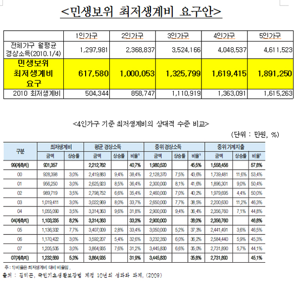 최저생계비는 이 사회에서 살아가기 위한 최소한의 인간다운 삶의 기준이다. 또한 150만 명이 넘는 수급자뿐만 아니라 수많은 가난한 이들의 복지 수급의 기준선이 되고 있다. 하지만 최저생계비의 상대적 수준은 지속적으로 낮아져왔다. 2010년 최저생계비는 제도 도입 이래 가장 낮은 인상률 2.75%가 적용되어 1인 가구, 50만 4344원, 4인 가구 136만 3091원에 불과하다.