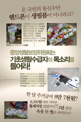 수급당사자, 혹은 수급당사자를 대변하는 역할을 담당하던 단체가 철저히 배제된 채 운영되는 중앙생활보장위원회의 의결과정에 대응하고자, 수급당사자와 반빈곤활동단체들이 결합해 민중생활보장위원회를 조직했다. 그리고 대응활동으로서 수급가구들의 7월 한 달 가계부를 살펴보기로 했다. 짧은 한 달의 기록으로 그들의 삶에 대해 우리가 무엇을, 얼마나 알겠는가마는-그 까잇 거 뭐, 대~충, 하루살이로 황제처럼 살았다고 자신 있게 말하는 사람도 있긴 했지만, 우리 사회의 빈곤한 사람들의 경제적 삶의 한 단면을 간접적으로나마 엿보고자 했다.