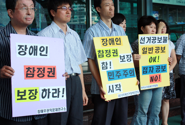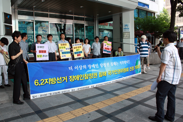 2010지방선거장애인연대(이하 선거연대), 장애우권익문제연구소, 한국뇌병변장애인인권협회, 한국시각장애인연합회, 한국장애인단체총연맹이 22일 오전11시 국가인권위원회 앞에서 ‘6.2지방선거 장애인참정권 침해 진정을 위한 기자회견’을 열었다.
