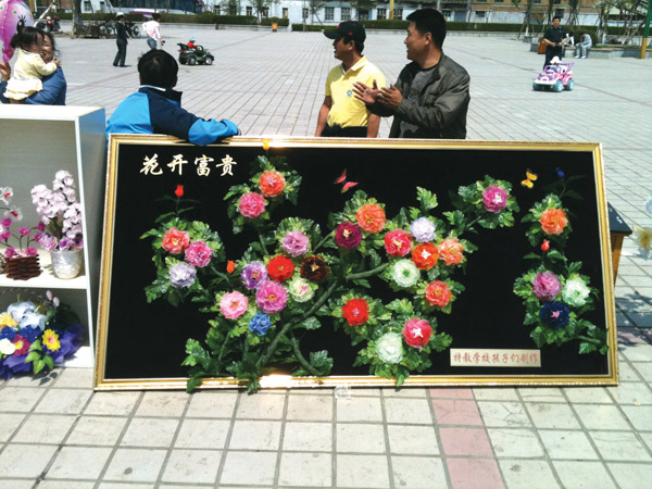 | ▲ 광장에 전시된 훈춘시 특수학교 재학생들이 만든 조화 ⓒ김라현 기자 | ||