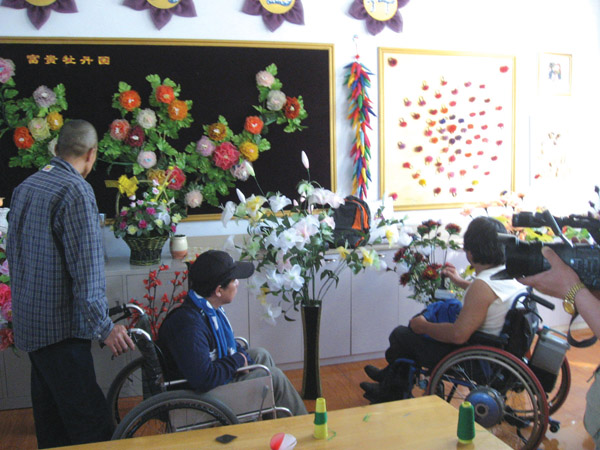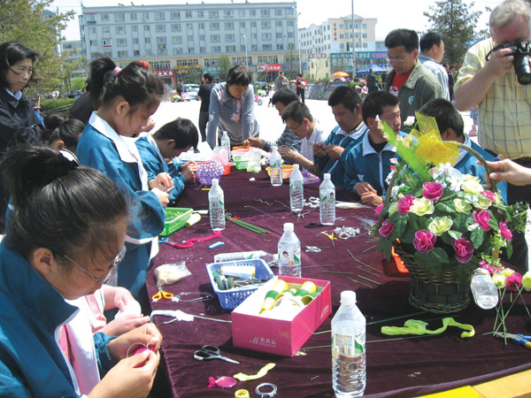 | ▲ 훈춘시 특수학교에 다니고 있는 장애우들이 광장에서 조화 만들기 시범을 보이고 있다. ⓒ김라현 기자 | ||