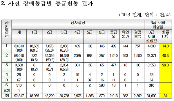 1급에서 2급으로 하락된 경우는 25.6%였으며, 3급 이하로의 하향율은 14%, 등급 외로 판정받은 경우도 5%에 달한 것으로 조사됐다. 또 2급에서 3급 이하로 등급이 하향 조정된 비율도 40%에 달했다.