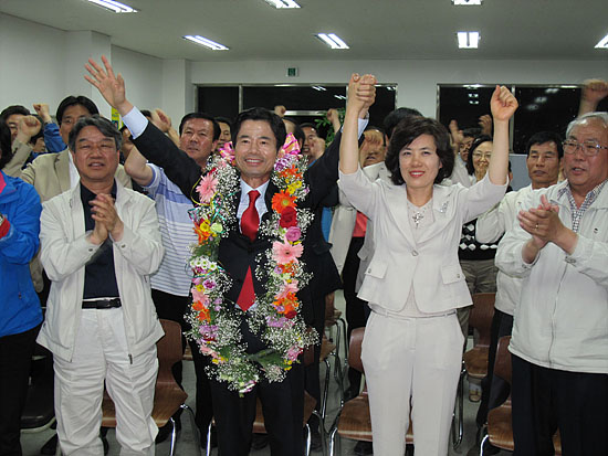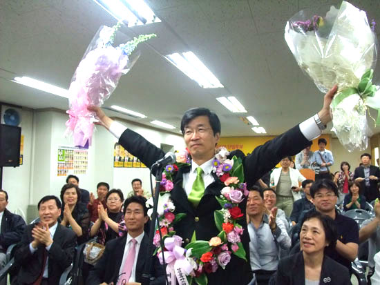 | 장만채 후보가 전남교육감 당선이 확실시되자 지지자들의 환호에 답하고 있다. [출처: 교육희망] | ||