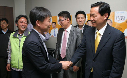 | '축하드 립니다' 2일 자정 경기교육감으로 재당선이 확정된 김상곤 교육감의 선거사무실을 찾은 민주노총 강승철 사무총장이 김 교육감과 반갑게 악수를 나누고 있다. [출처: 노동과세계 이명익 기자] | ||