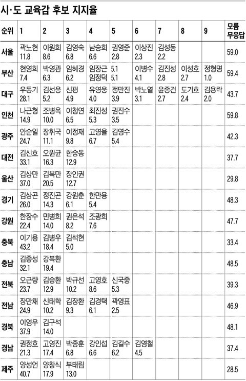 하지만 ‘모름 또는 무응답’이 지역에 따라 60%(인천 59.8%, 서울 59%, 경기48.3% )까지 나왔다. 같은 날(24일) 조사된 한국일보 여론조사에서도 전체 응답자의 76.3%가 주요 교육감후보에 대해 “모르고 있다”고 답변했다. 여론조사 결과도 들쭉날쭉이라 선거결과를 예단하기는 아직 어려운 상황이다.