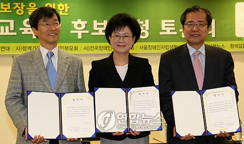 | ▲ (서울=연합뉴스) 백승렬 기자 = 서울시 교육감에 출마한 곽노현, 남승희, 권영준 후보가 17일 서울 사회복지공동모금회 강당에서 열린 서울시 장애인 교육권 보장을 위한 서울시 교육감 후보자 초청 토론회에서 공약이행 협약서에 서명하고 나서 기념촬영하고 있다. 이날 토론회에는 서울시 교육감 출마자 8명 중 4명이 개인적인 사정으로 불참해 3명만이 토론에 참석했다. srbaek@yna.co.kr | ||