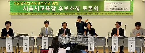 곽노현 후보 “특수교육발전협의회, 부활 넘어서 실질화 시키겠다” 곽노현 후보(한국방송통신대학교 법학과 교수)는 “공교육은 단 한명의 학생도 포기하지 않은 무한책임 교육.”이라고 전제한 뒤 “현재 공교육은 공부 잘하는 소수의 학생을 제외한 나머지는 포기하는 교육이기 때문에 장애학생의 소외는 말할 필요도 없을 지경이다. 장애 유무를 떠나 학부모들의 마음은 똑같은 심정이라 생각하고, 부모들의 마음으로 이 문제를 해결해 나가겠다.”고 말했다.