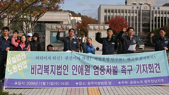 또 “해고자 5명이 지노위와 중노위에서 부당해고와 원직복직 판정을 받았는데도 법인은 아직까지 이를 이행하지 않고 있다”며 “내부 고발자 원직복직과 시설민주화를 위한 활동 때문에 억울하게 해고된 5명의 복직을 위한 구체적인 방안을 제시해 달라”고 요구했다.