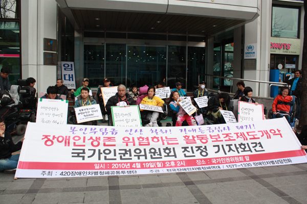 그리고 지난 19일, 420장애인차별철폐공동투쟁단이 국가인권위원회 앞에서 ‘활동보조 제도 개악 인권위 진정 기자회견’을 열었다. 이 날 활동보조인 제도와 관련해서 장애인들이 인권위에 진정한 내용의 핵심은, 장애 등급 재심사로 인해 활동보조인 지원 서비스를 받고 있던 장애인들이 더 이상 활동보조인 지원 서비스를 받지 못하게 됐다는 것이었다.