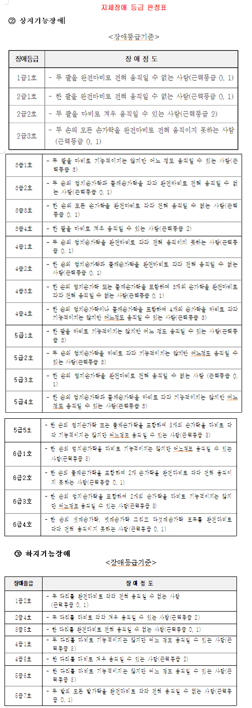 가령 장애판정표에 따르면 지체장애인 는 양 다리를 사용하지 못하면 장애 1급 판정을 받게 되어 있다. 즉 지체장애인은 다리를 사용하지 못해서 휠체어를 타면 무조건 장애 1급 판정을 받게 되어 있는 것이다.(지체장애인 판정표 참조) 하지만 뇌병변 장애인 판정표는 장애인이 다리 경직이나 마비 등으로 휠체어를 타도 1급 장애 판정을 받을 수 없게 되어 있다.