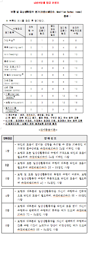 장애판정표에 따르면 구체적으로 장애판정 뇌병변 장애 등급 기준은, 타인의 도움이 없이는 생명을 유지할 수 없는 비가역적 혼수상태로 수정바델지수가 24점 이하인 사람과, 보행과 모든 일상생활동작의 수행에 전적으로 타인의 도움이 필요하며 수정바델지수가 24점 이하인 사람만 장애 등급 1급이라고 명시하고 있다.
