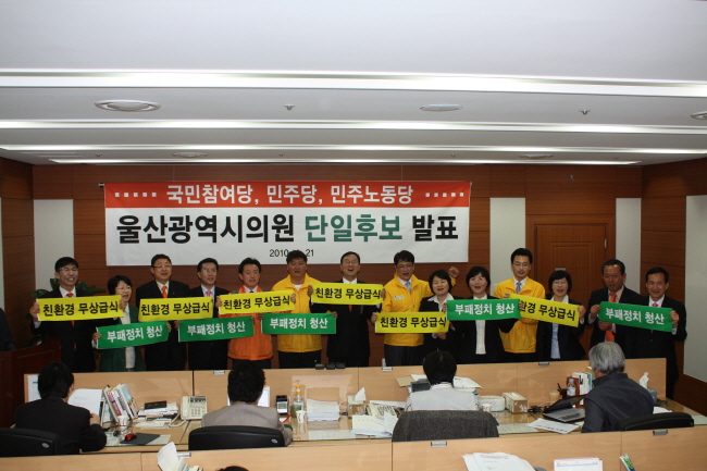 민주당울산시당 임동호 위원장은 "20일 3당 울산시의원 단일후보를 최종 결정했다"며 "3당 시의원 단일후보는 친환경 무상급식, 울산시의원 윤리실천협약을 공동공약으로 합의하고 110만 울산시민 앞에 약속한다"고 밝혔다.